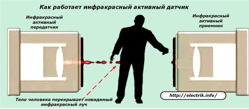 La composición de dicho sensor incluye un transmisor y receptor activo por infrarrojos. Funcionan como un kit. Invisible para el ojo humano, se envía constantemente un haz de radiación desde el transmisor al receptor. Si está bloqueado, se produce una alarma de inmediato.