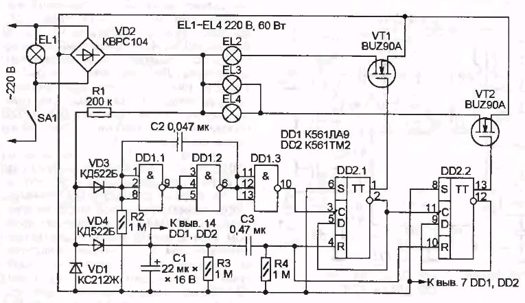 Cuando enciende el dispositivo después de un apagado prolongado (al menos 15 segundos) condensador electrolítico C1 completamente descargado Cuando el interruptor SA1 está cerrado, el voltaje pulsante del puente rectificador VD2 con una frecuencia de 100 Hz a través de la resistencia R1 genera pulsos de voltaje limitados por el diodo Zener VD1 a 12V. Con estos pulsos, un condensador electrolítico C1 comienza a cargarse a través del diodo de desacoplamiento VD4. En este momento, la cadena diferencial C3, R4 genera un pulso de alto nivel en las entradas R de los disparadores DD2.1, DD2.2, y el contador se reinicia al estado 00. Los transistores VT1, VT2 están cerrados, por lo que cuando la lámpara se enciende por primera vez, las lámparas EL2 ... EL4 no se encienden. Solo la lámpara EL permanece encendida, ya que se enciende directamente mediante el interruptor.