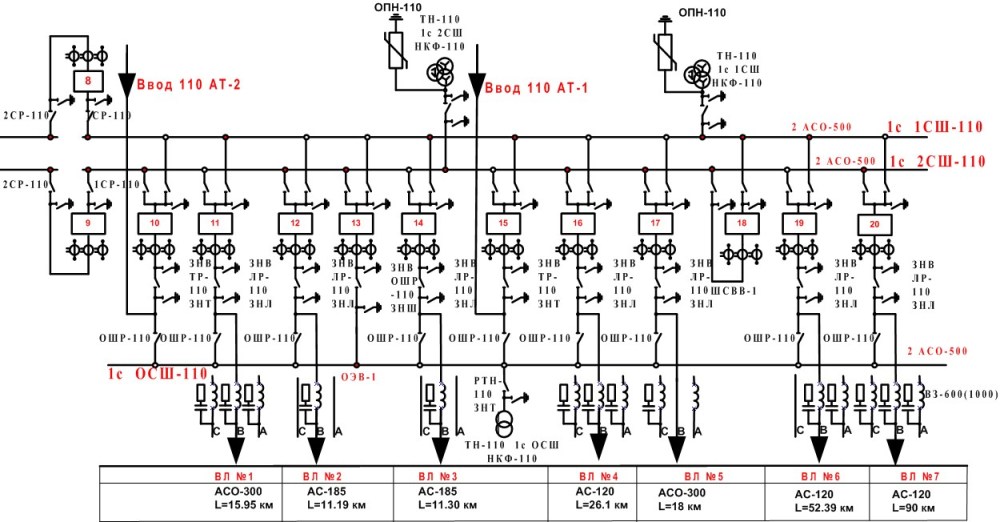 Aquí, es posible transferir energía desde las entradas de 110 AT No. 1 o AT No. 2. En el circuito, cada entrada AT se conectaba a su sistema de bus con los interruptores No. 10 y No. 15, con los neumáticos divididos en secciones a través de los interruptores No. 8 y No. 9 cuando se usa un sistema de bus de derivación conmutado por el interruptor No. 13. Los neumáticos 1SSh y 2Sh se pueden combinar con el interruptor No. 18.